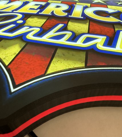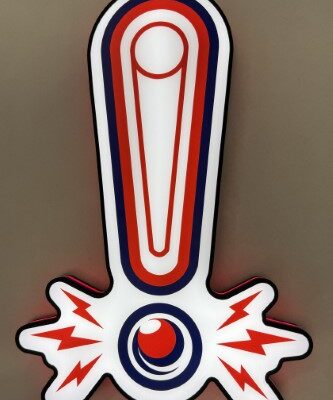 Pin-Signs are contour shaped light up desktop signs that also have holes to hang on a wall. American Pinball Shield Extra Large Pin-sign measuring 22x17x2 Inches