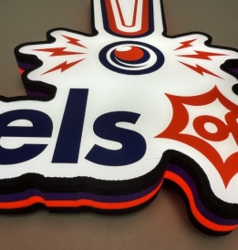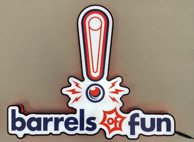 Pin-Signs are contour shaped light up desktop signs that also have holes to hang on a wall. Barrels of Fun Full Logo Text Pin-Sign Extra Large measuring 23x19x2 Inches