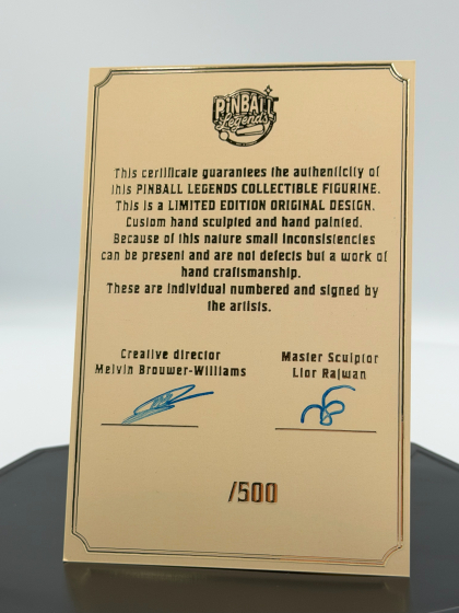 Limited edition collectible figurines are numbered and have a maximum limit of 500 per figure, come with a certificate with the figure number XXX/500 as well as a hologram, they also have a base with matching figure number XXX/500 as well hologram matching the certificate. They also come in their own Pinball Legends designer box with ample padding to prevent breakage and that box has the figure number outside the box as well. Simply open them up, put the figure on it’s base, and attach any accessory items (usually have magnets) and you have a great conversation piece and an element of a great pinball accessory collection!