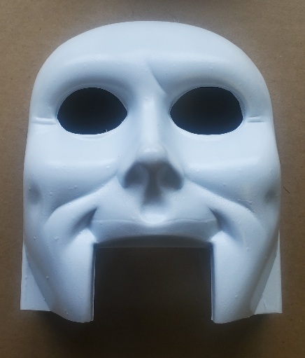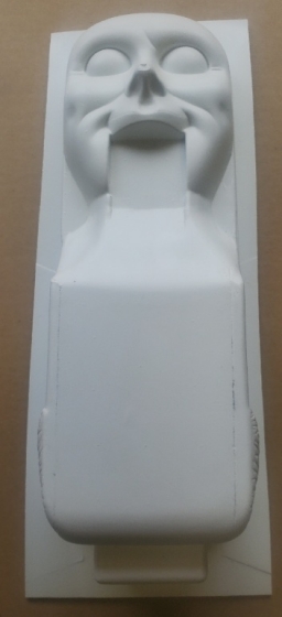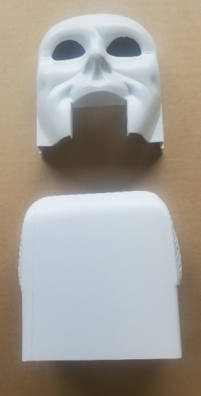 Molded Face and Back of Head for Red from Road Show UNDECORATED, 2 Pieces. These are original WMS Molds 31-2018-1 Face, and 31-2018-2 Back of Head for Red from Road Show molded in White Styrene which was one of the ways vs colorized (which would often mismatch the colors of the jaw and eyes) that this was molded, it is undecorated and cut per original. Slightly thicker material which is vacu-formed, and drawn. Decorate your own. Note that there were a couple different styles and this mold included the stronger hair relief on the sides of the back piece.